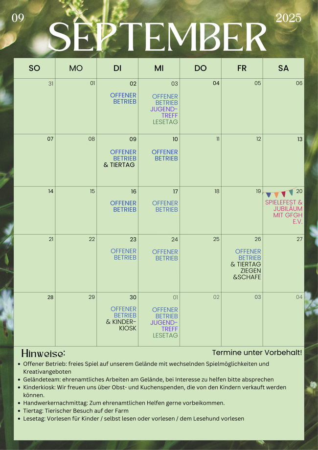 Freitag 26.210.25 geöffnet und Tiertag Ziegen und Schafe Hier unser aktueller Monatsplan: